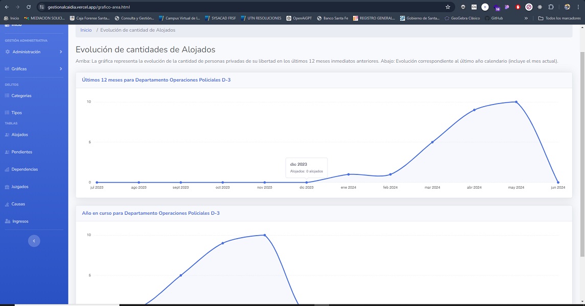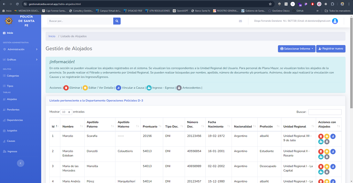 Sistema Web basado en sirvicios REST. Los servicios se construyeron en Java 17 y Spring. Persistencia de la informacion en base de datos relacional basada en el motor de PostgreSQL. ORM Hibernate. Frontend desarrollado a partir de Bootstrap, con HTML, CSS y JavaScript puro. Para el inicio de sesion se utilizó JWT. El sistema permite la carga de los datos de las personas que se encuentran privadas de su libertad en la provincia de Santa Fe. El registro incluye la vinculación con las causas judiciales correspondientes, y mantiene el historial de ingresos/egresos. Para la comunicación entre las distintas unidades se implementó un canal de mensajería instantánea a través de WebSockets.