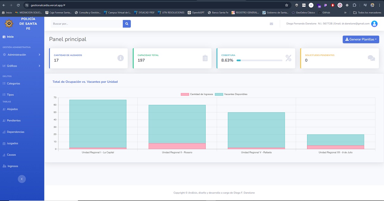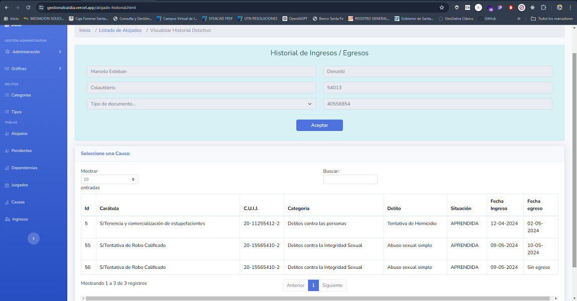 Sistema Web basado en sirvicios REST. Los servicios se construyeron en Java 17 y Spring. Persistencia de la informacion en base de datos relacional basada en el motor de PostgreSQL. ORM Hibernate. Frontend desarrollado a partir de Bootstrap, con HTML, CSS y JavaScript puro. Para el inicio de sesion se utilizó JWT. El sistema permite la carga de los datos de las personas que se encuentran privadas de su libertad en la provincia de Santa Fe. El registro incluye la vinculación con las causas judiciales correspondientes, y mantiene el historial de ingresos/egresos. Para la comunicación entre las distintas unidades se implementó un canal de mensajería instantánea a través de WebSockets.